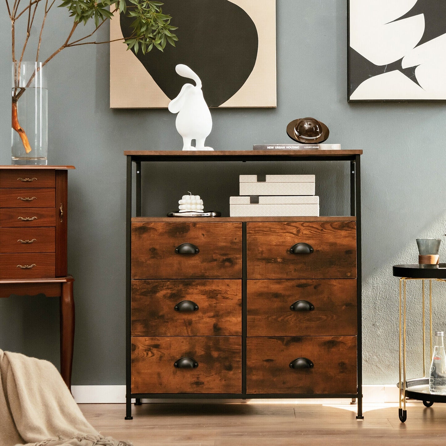 2-Tier Storage Chest with Wooden Top and 6 Fabric Drawers-Rustic Brown