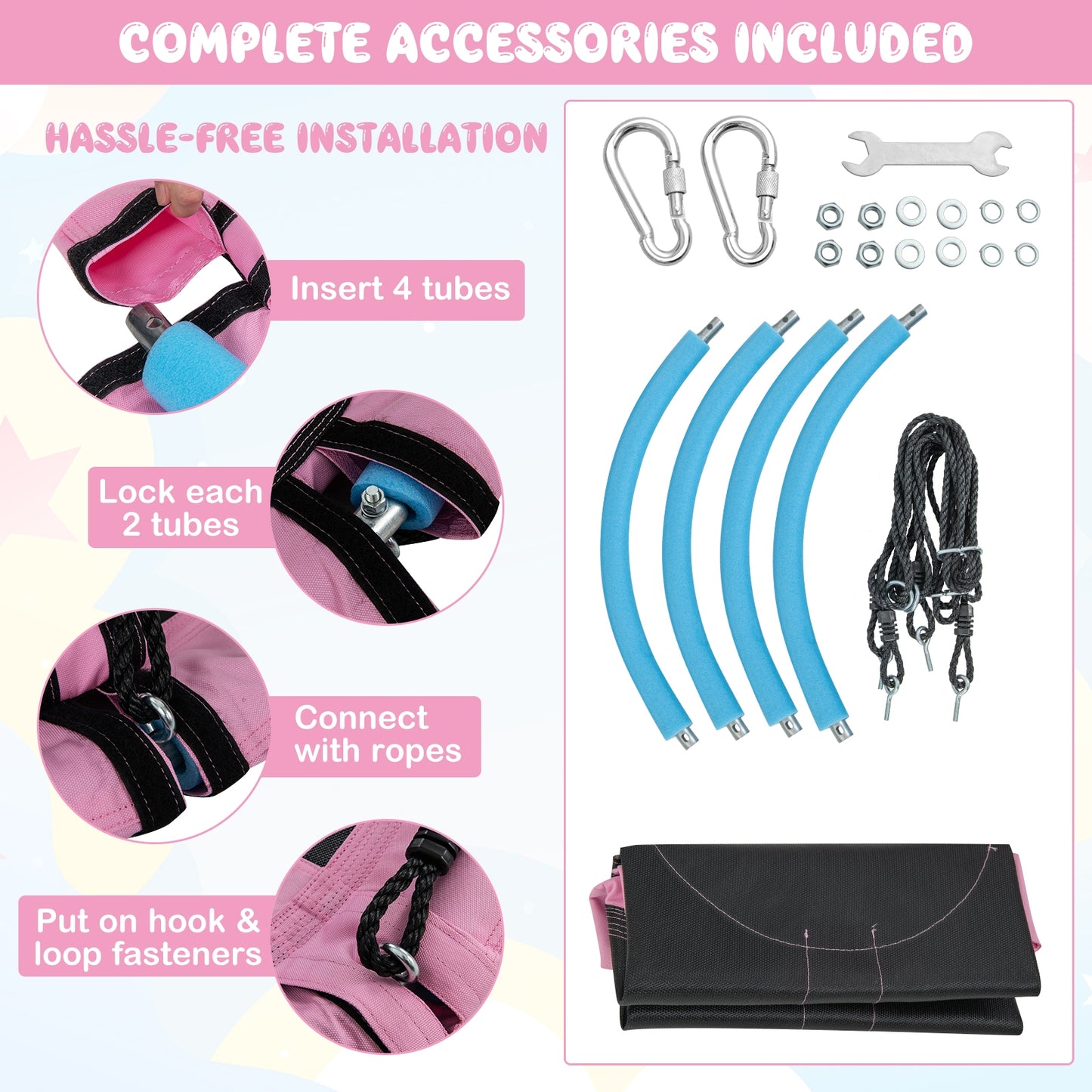 ● Hassle-free Installation: With detailed instructions and complete accessories included the flying swing seat can be easily installed. You can do the following steps to finish the installation: ① Insert 4 tubes. ② Lock each 2 tubes. ③ Connect with ropes. ④ Put on hook and loop fasteners.
