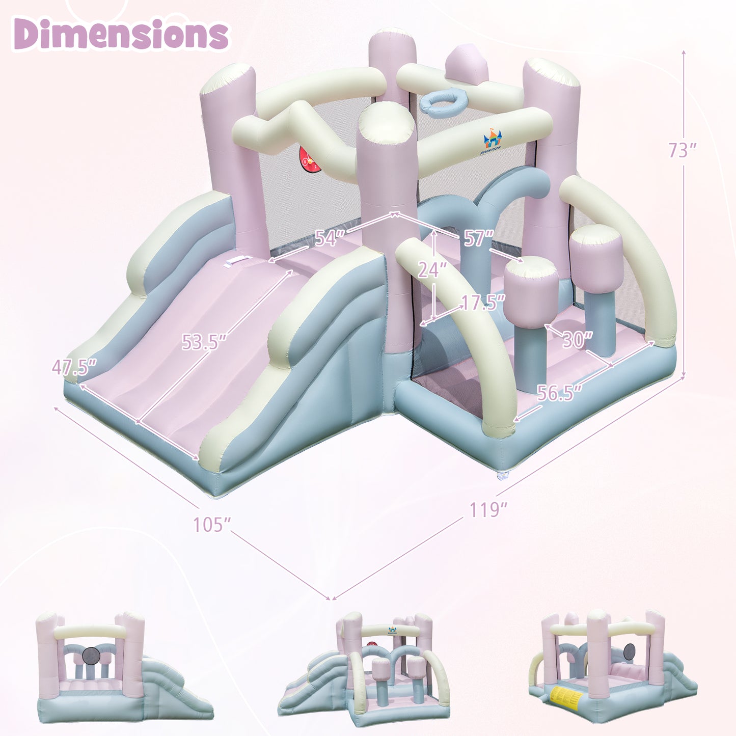 ● Enjoy Macaron Marvel: Perfect for any celebration the bounce house boasts a lovely pastel design. The jump house also has multiple game settings to keep the fun going including a jumping mat for energetic play a slide with straps for climbing and dual boxing columns that add a punch of fun.
