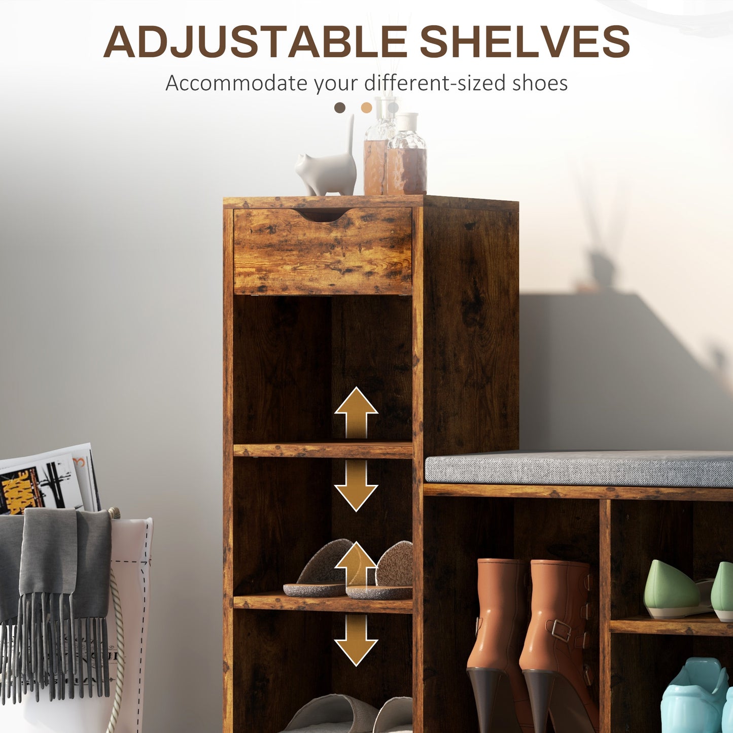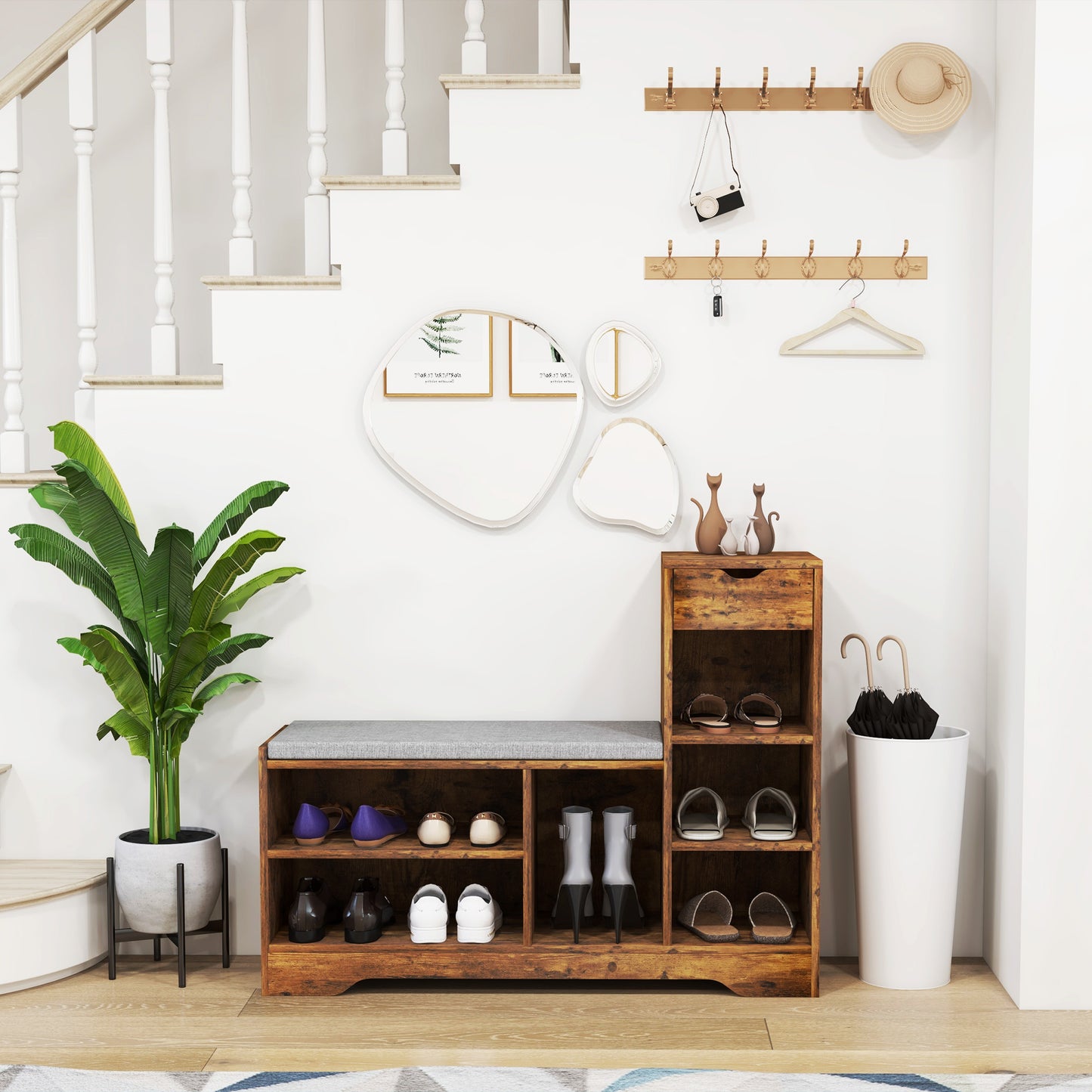 Upholstered Shoe Storage Bench w/ Seat, Entrance Bench w/ Drawer and 6 Open Shelves for Hallway, Rustic Brown